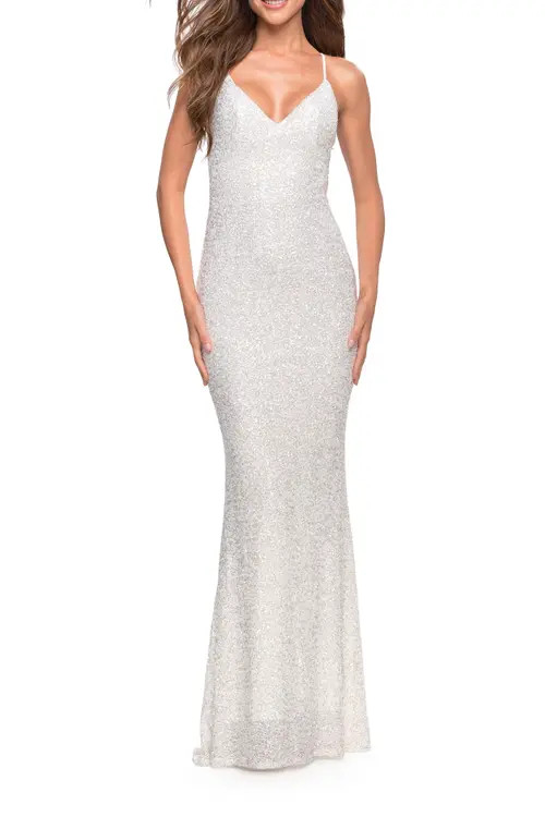 La Femme Luxurious Soft Sequin Dress with V Neckline in White at Nordstrom, Size 12