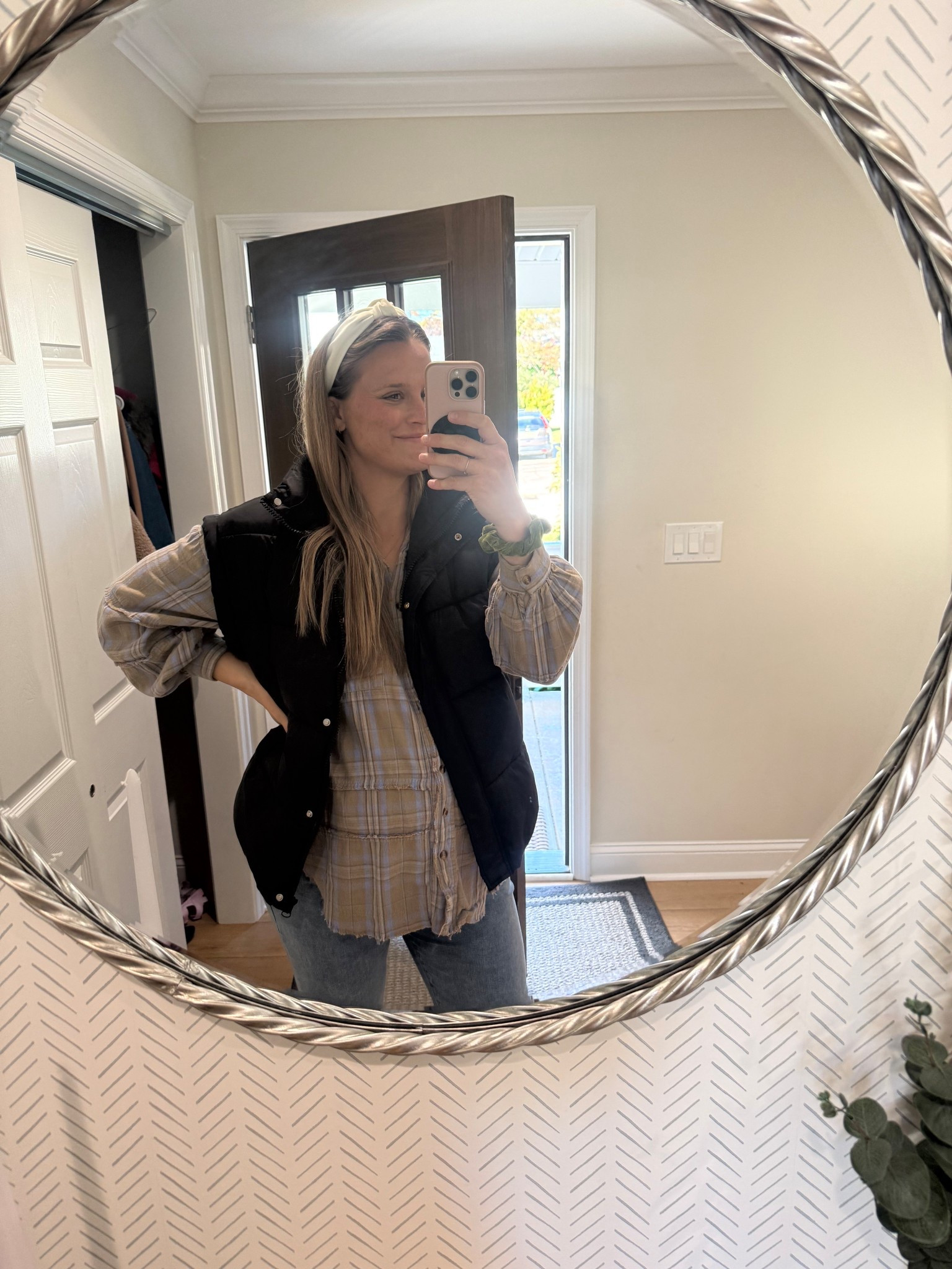 Bump friendly jeans and perfect cardigan/jacket- can dress up or down!