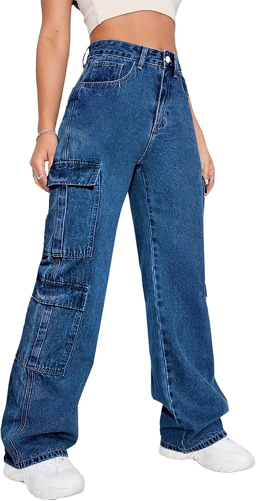 Women's High Waist Cargo Jeans Flap Pocket Baggy Cargo Pants Y2K Wide Leg Denim Jeans Y2K Streetw...