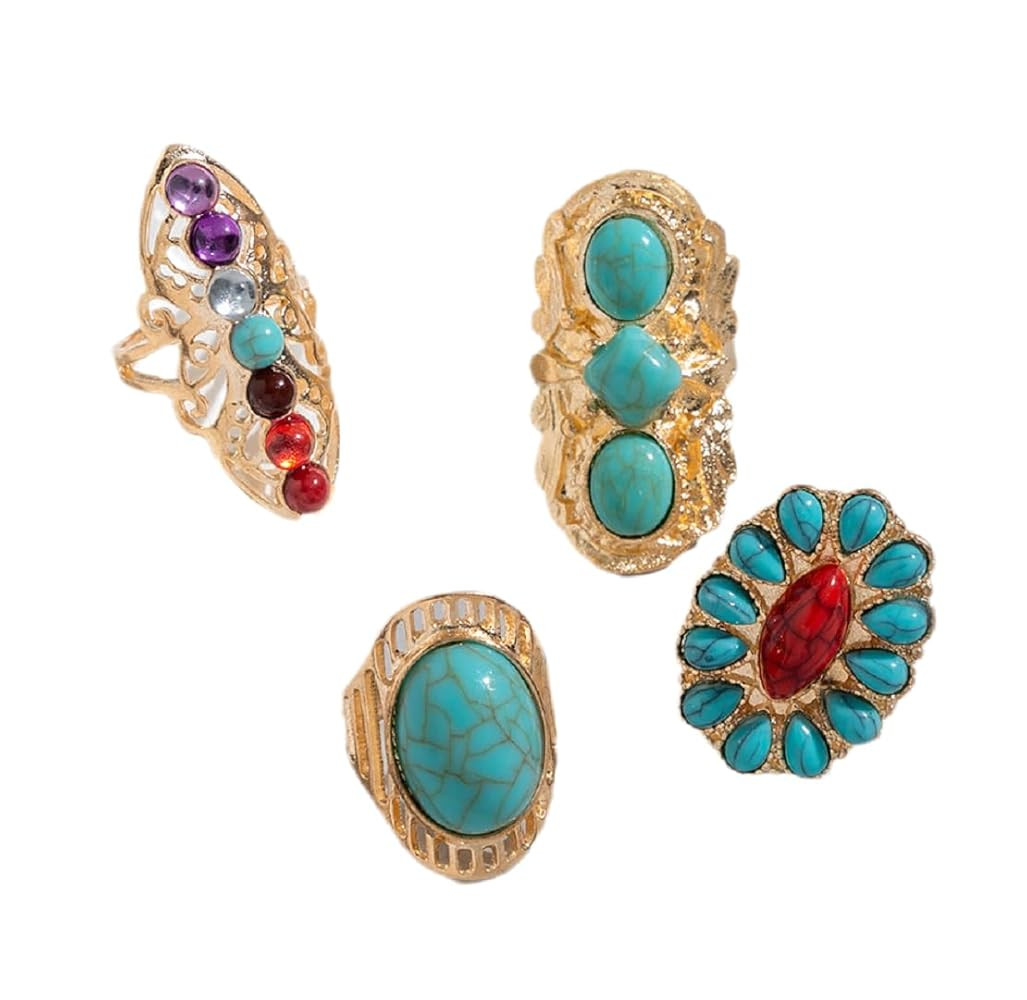 4 Pcs Bohemian Vintage Turquoise Oval Flower Rings for Women Geometric Ethnic Natural Stone Adjus...