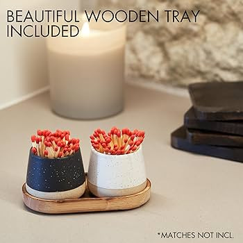 KIBAGA Decorative Ceramic Match Holder With Wooden Tray - Set of 2 Beautiful Matte Holders with S...