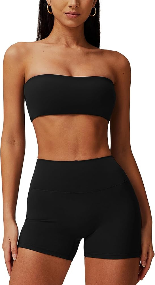 ABOCIW Women Workout Sets Bandeau Bralette Sports Bra Scrunch Butt Lifting High Waist Shorts 2 Pi...