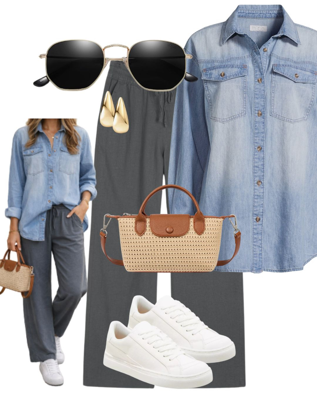 Denim top, knit pants. No notes. Week 13 Monday outfit from my 2026 capsule wardrobe!