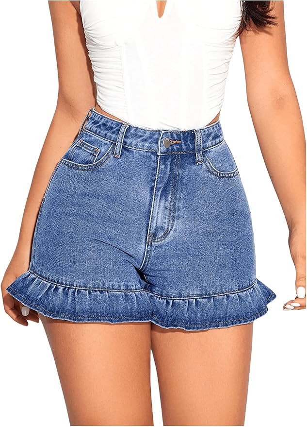 Women's Ruffle Hem Shorts High Waist Zipper Straight Leg Denim Shorts