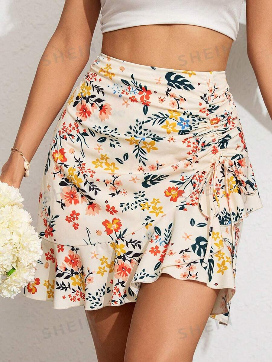 SHEIN VCAY Women's Summer Ditsy Floral Drawstring Ruffle Hem Romantic Vacation Mini Skirt