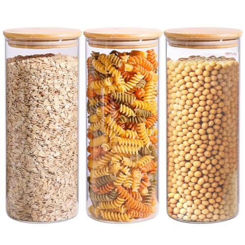 ComSaf 56oz Glass Storage Containers with Lids, Glass Jars with Lids, Clear Food Storage Jar, Round Canister Set of 3, Pantry Organizers for Pasta Flour Cookie Rice Tea Coffee Bean