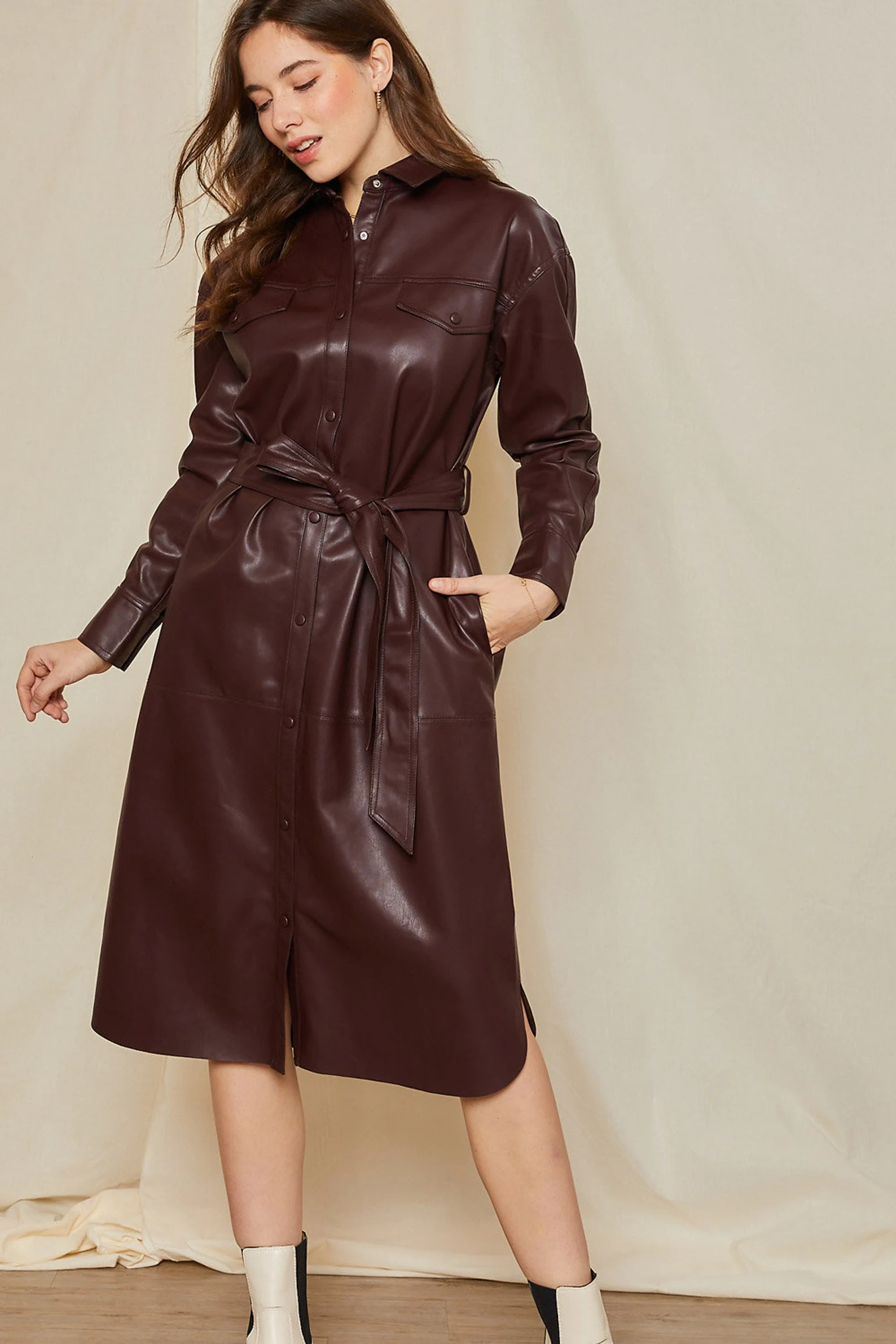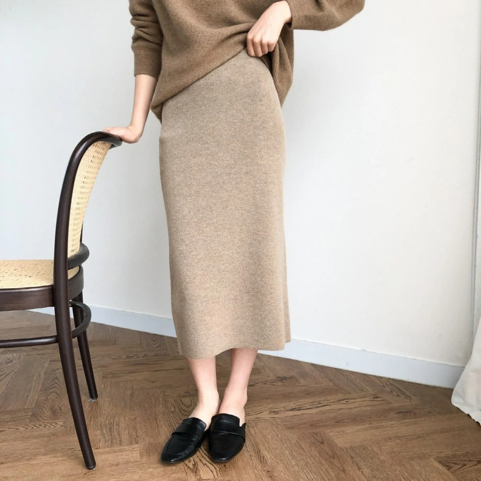 Knit sweater dress, cardigan, tweed mini skirt, shearling jacket, trench coat, fur coat, boots…