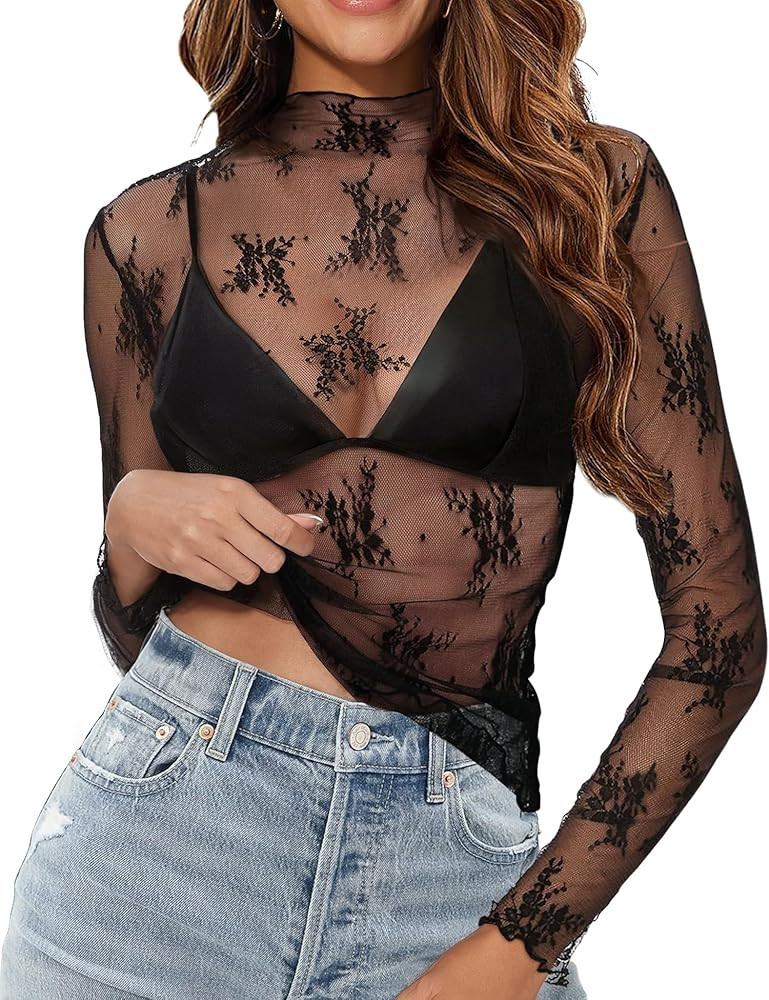 Women Mesh Top Long Sleeve Layering Top Mock Neck Sheer Lace Top See Through Floral Sheer Blouse