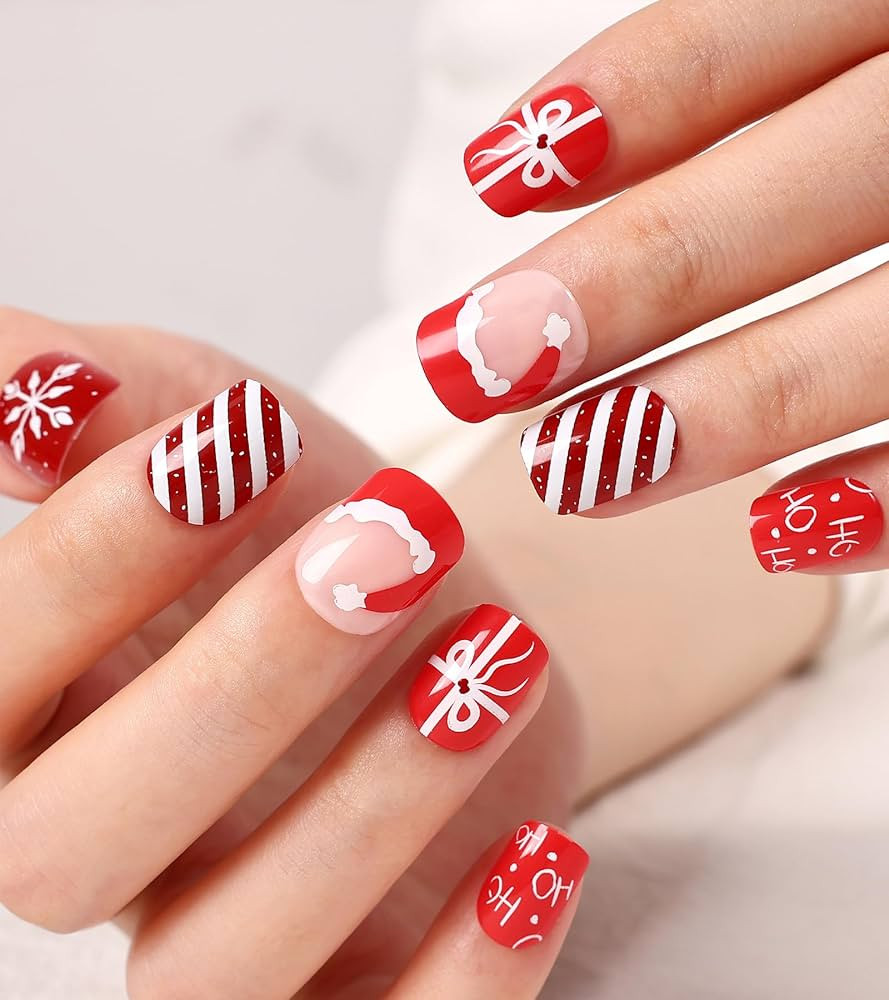 Kikmoya Square Christmas Press on Nails Short Fake Nails with Santa Hat OH Red Candy Cane Stripe ...