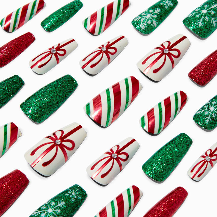 Holiday Stripes & Glitter Squareletto Press-On Faux Nail Set - 24 Pack