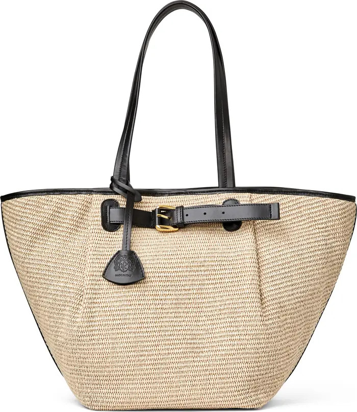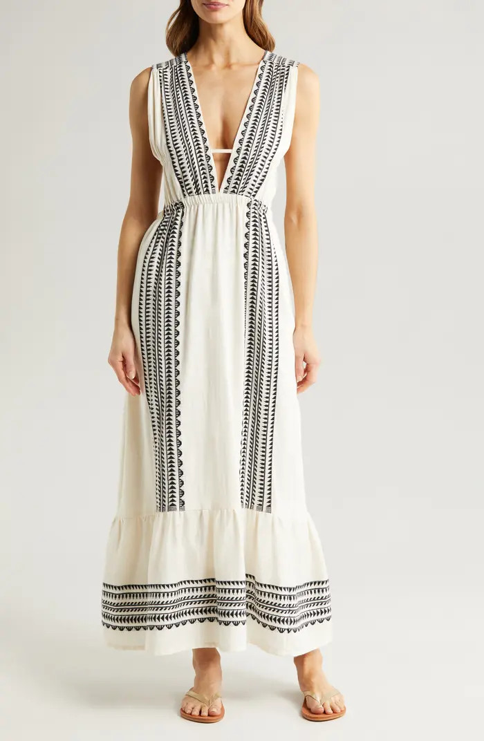 A flowy maxi dress paired with oversized sunglasses, straw sandals, and a straw beach bag.