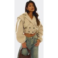 Long Sleeve Cinched Waist Cropped Wool Look Trench Jacket In Beige, Women's Size UK 4