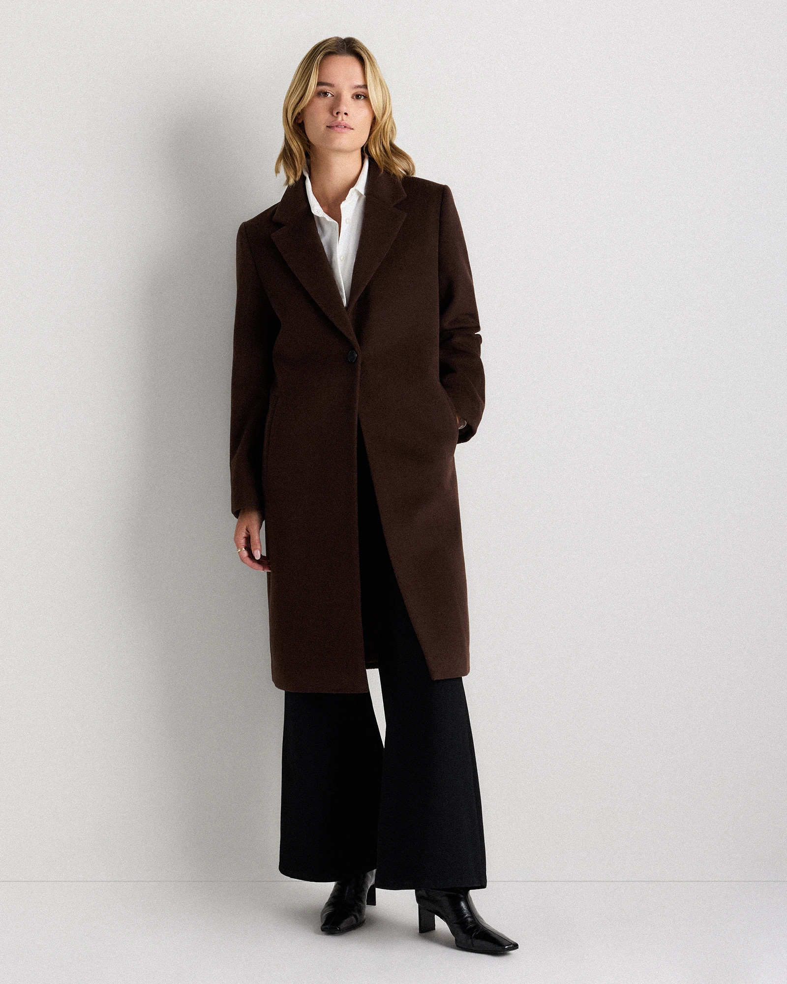 Deep espresso tones styled with luxe brown boots and cozy polished layers.