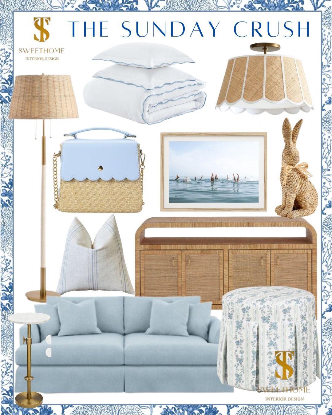 fun new finds. coastal home decor, coastal rug, coastal artwork, geometric floral scallop wallpaper roll, coastal wallpaper,serena and lily floor lamp, serena and lily side table, overhead lighting, bleu and white, amazon rug, sideboard, rattan sideboard, grandmillenial home, stsweethome.