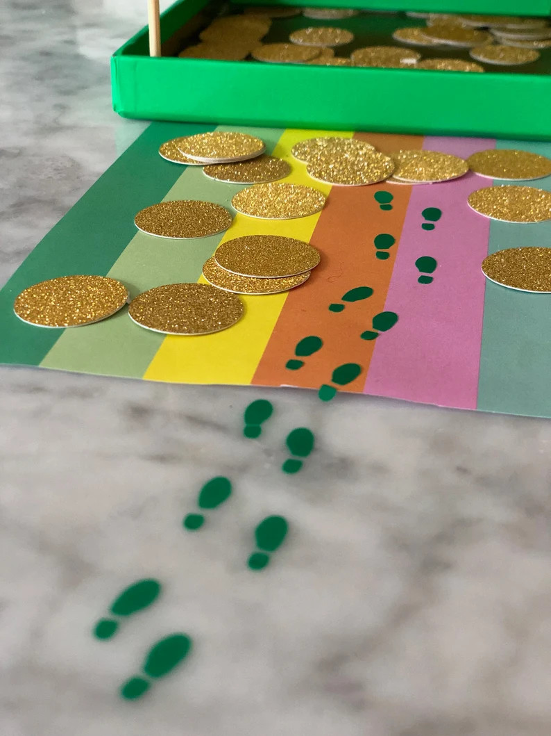 Items for leprechaun tricks for St. Patrick’s Day. Follow @sugarpiepaper March 1-17 for trick ideas!