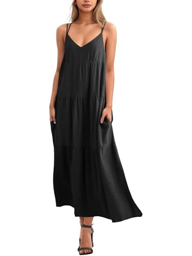 Febriajuce Women’s Summer Maxi Dress Casaul Spaghetti Straps Solid V-Neck Backless Cami Dresses with Two Pockets Black