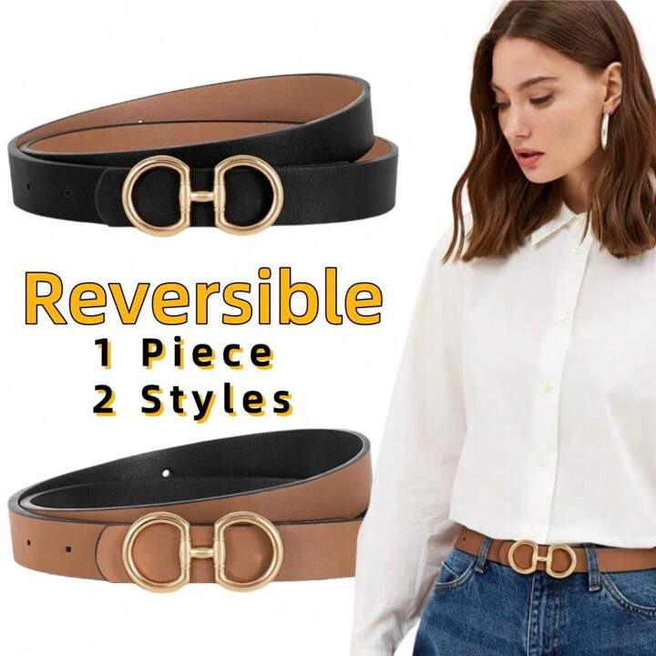 1PC Women Reversible Double D-Ring Gold Buckle Retro Fashion Style Smooth Durable PU Leather Belt...