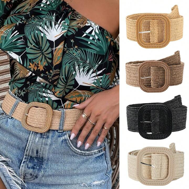 1pc Women Woven Wide Belt Fashion Belt With Wood Square Buckle For Dresses for Sale Australia| Ne...
