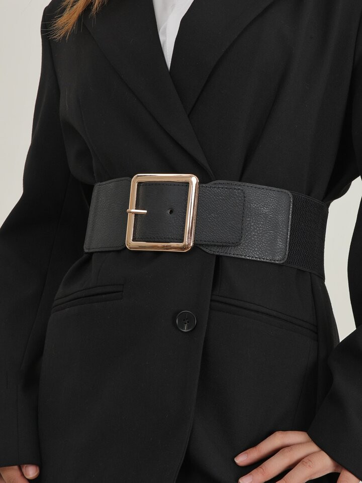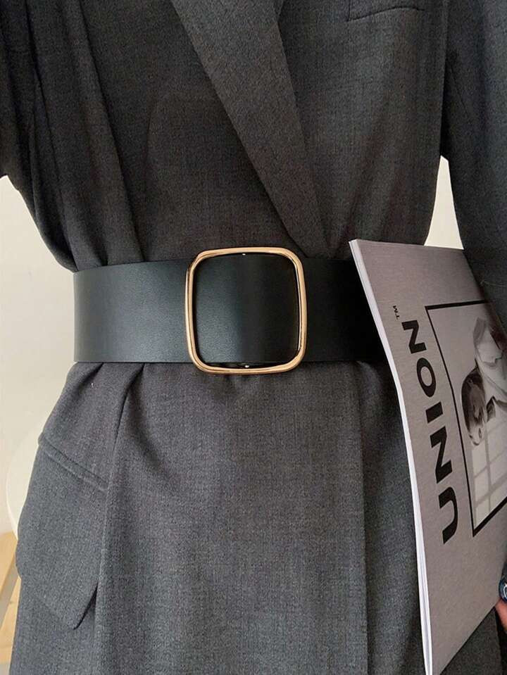 1pc Simple Wide Black Waist Belt With Gold Square Buckle Detail For Women, Perfect For Daily Wear...