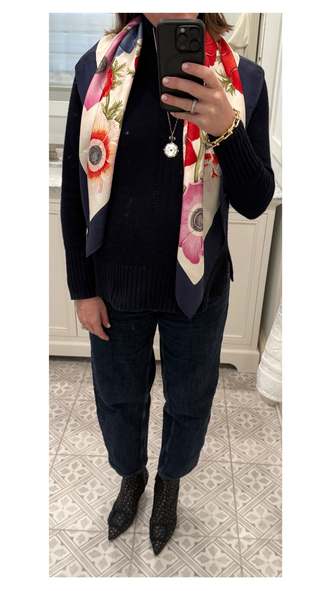 My new holiday Jimmy Choos fit in perfectly with the black and nude Bing heels I already own. They make every outfit so much more festive. They look great dressed up (I wore the nude to my wedding) and also elevate a more casual blue jean outfit!