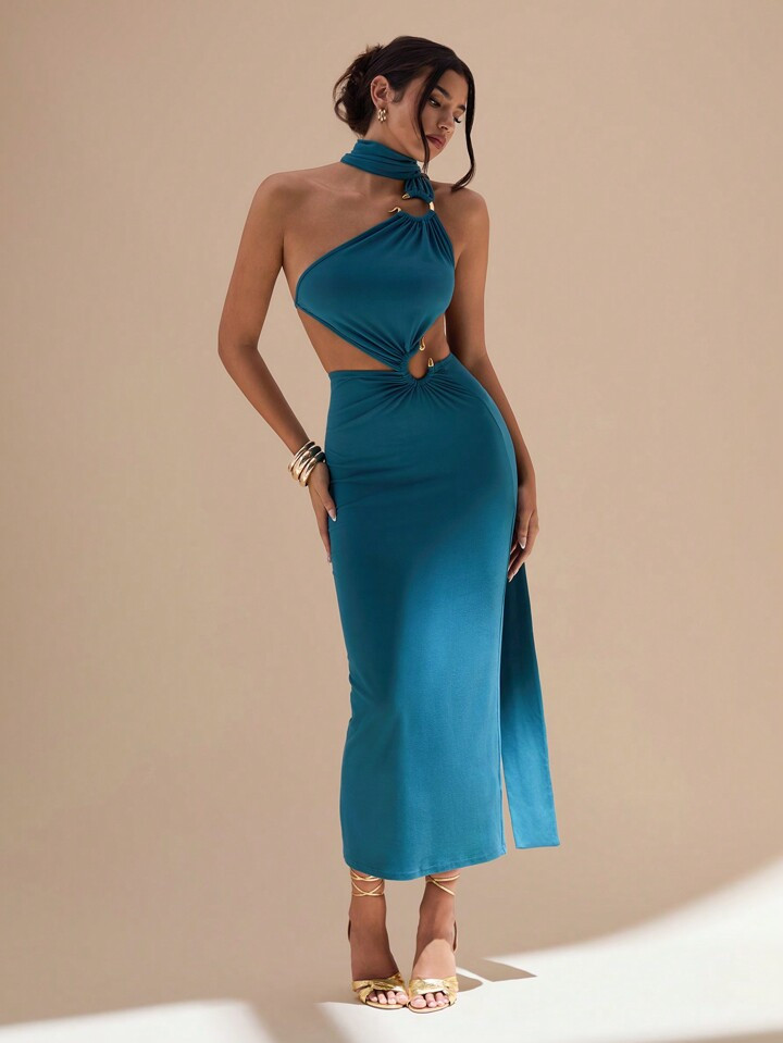 Glamine Summer Sexy Snake Shape Metal Ring Halter Backless Dress