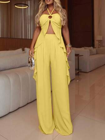 ChicMe 2 Pieces Outfit Crape Halter Ruffles Spaghetti Strap Tank And Casual Wide Leg Pants Set