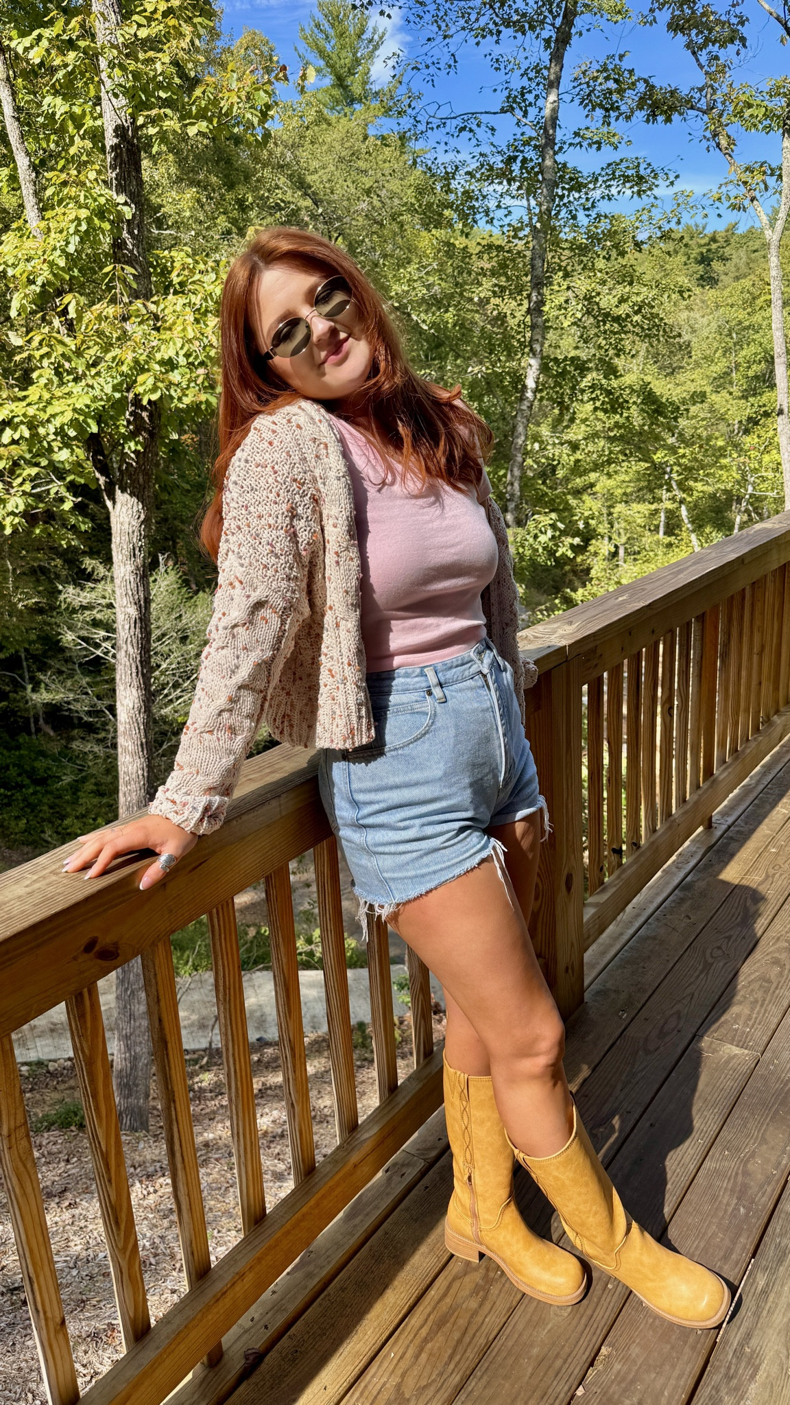 Feminine outfit featuring pink knee-high boots styled with a cozy sweater and mini skirt. These statement boots add the perfect pop of color while keeping the outfit playful and stylish for date nights, concerts, or casual events.