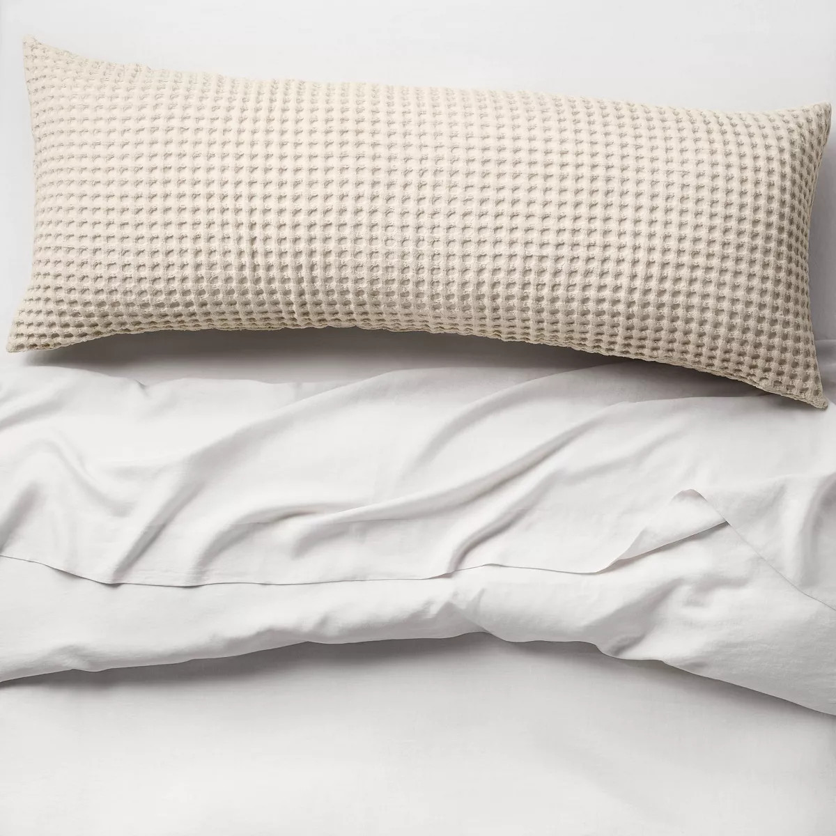 One of my favorite ways to fill a bed— 4 white pillows and one huge impactful lumbar.
