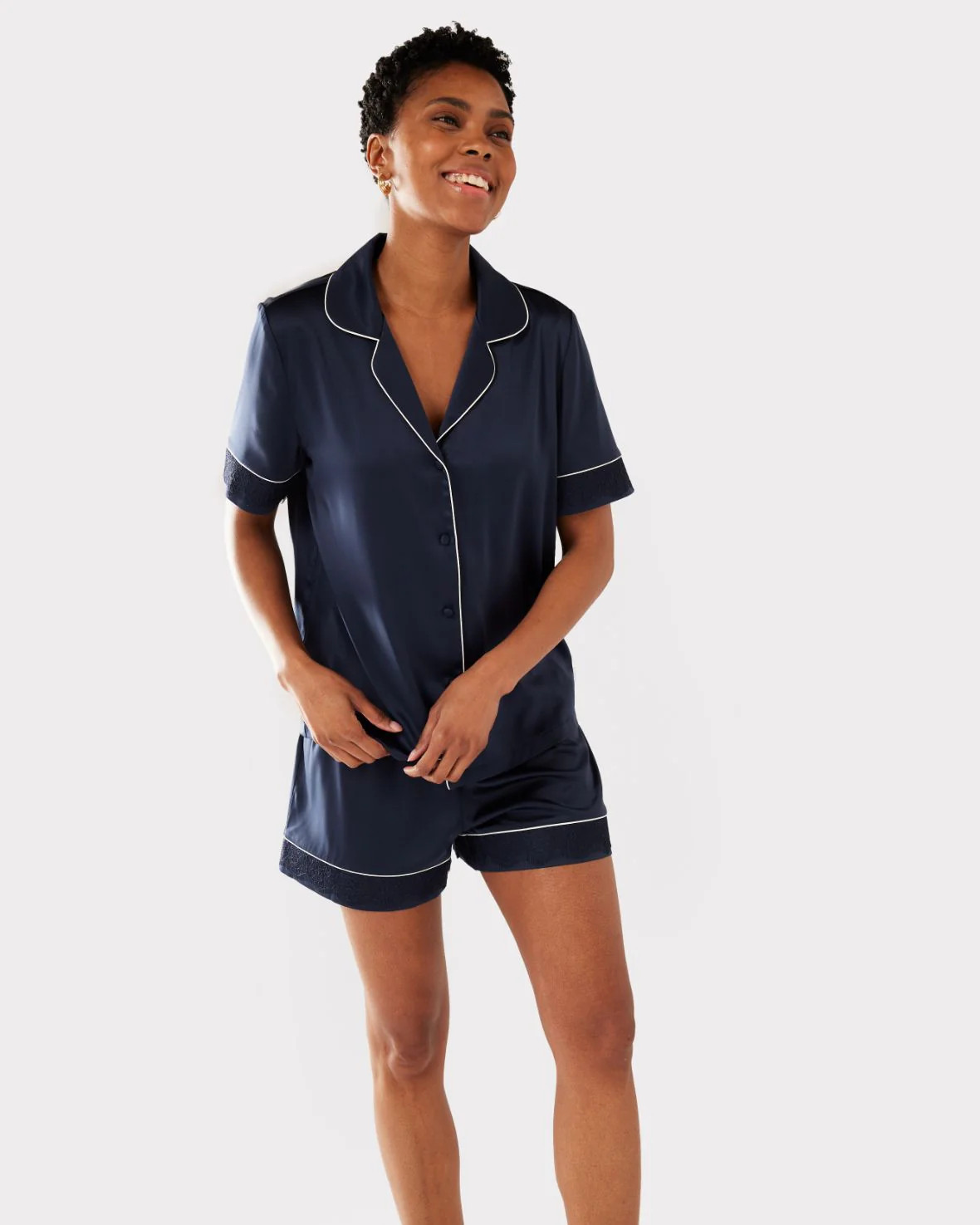 Satin Lace Trim Short Pyjama Set - Navy