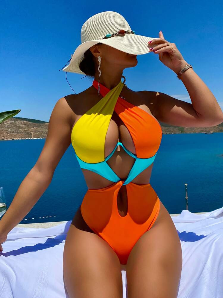 Color Block Cut Out One Shoulder One Piece Swimsuit