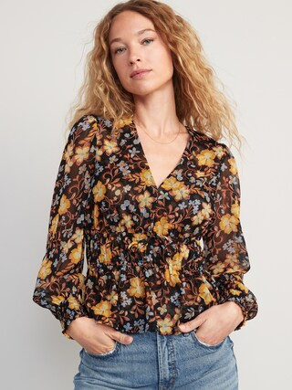 Puff-Sleeve Floral-Print Smocked Tie-Front Blouse for Women