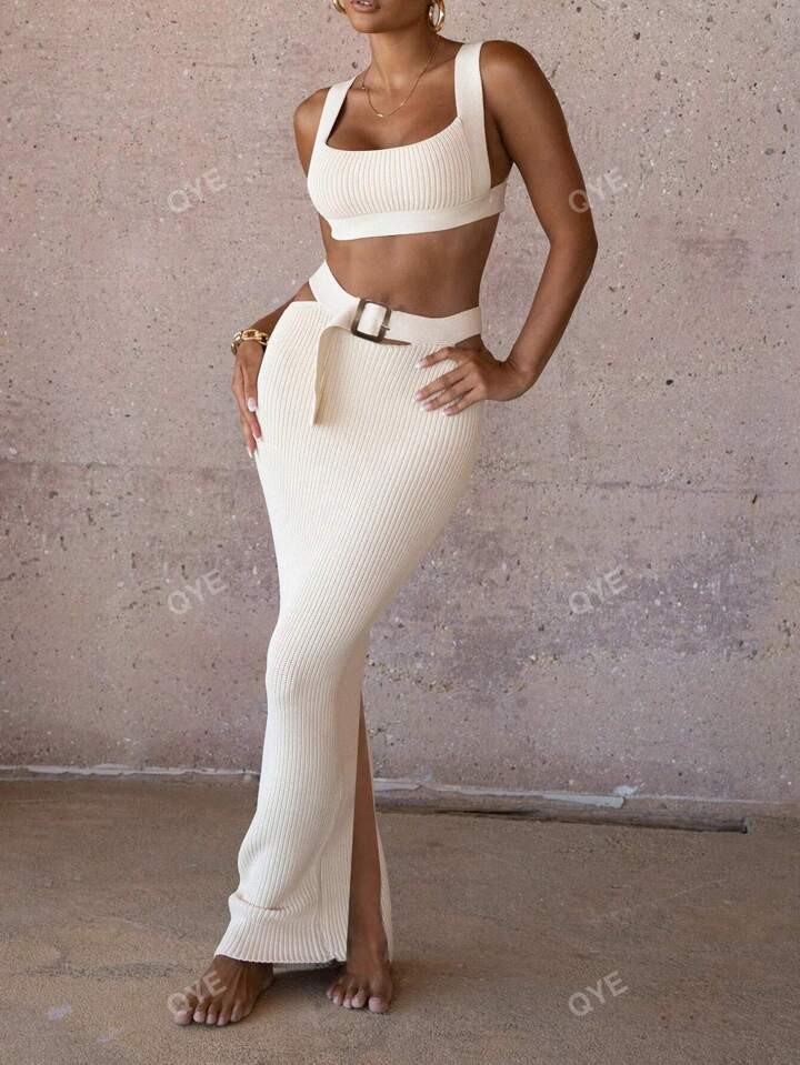 Solid Tie Backless Crop Knit Top & Buckle Waist Cutout Knit Skirt