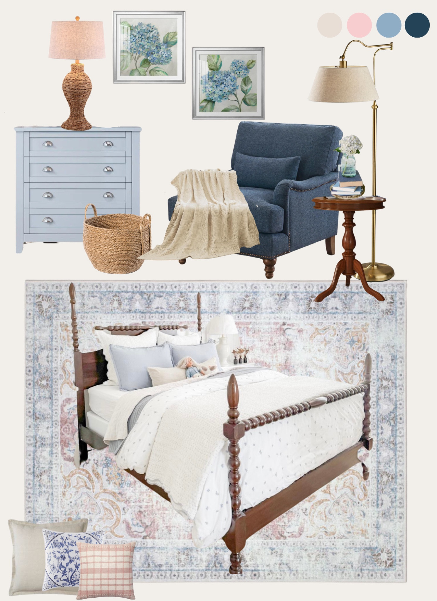 Bedroom decor in navy, gray and blush pink. Beautiful bedroom sitting area and place to relax for busy moms and dads