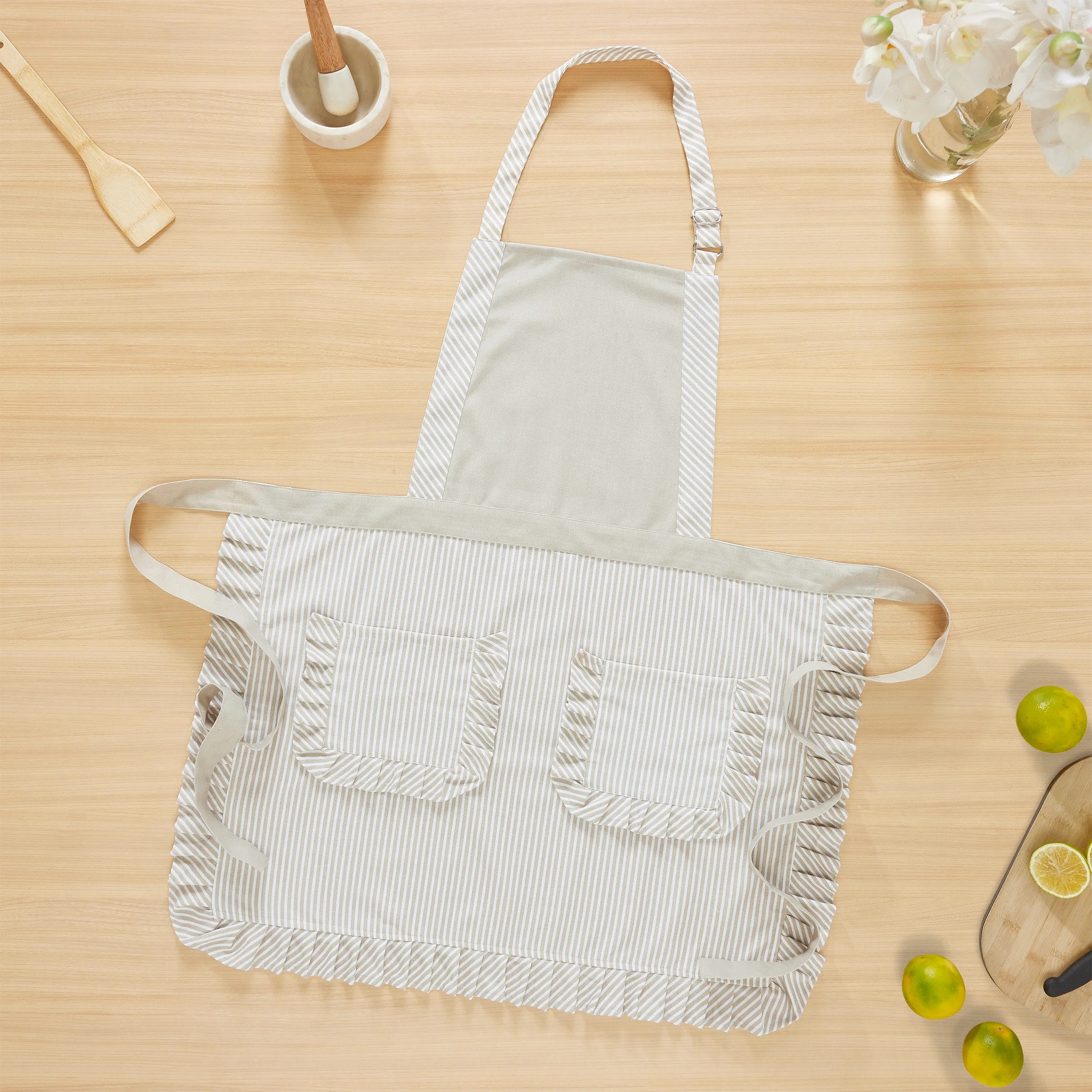 My Texas House Polyester/Cotton 30" x 54" Stripe Ruffle Apron, Taupe