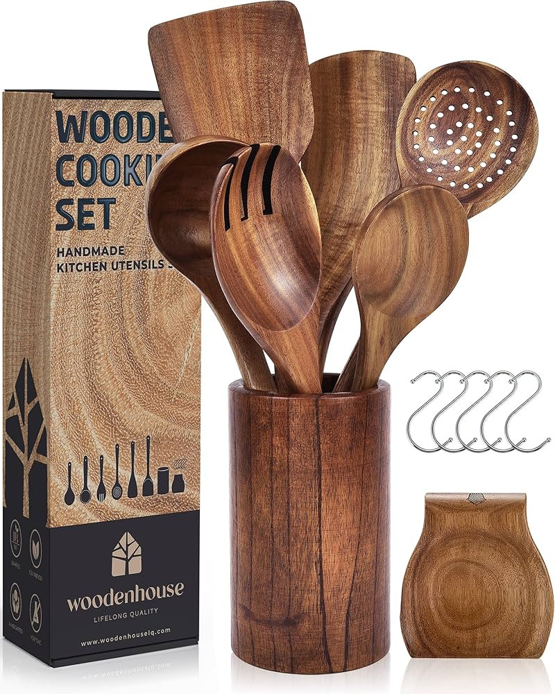 Wooden Spoons for Cooking, Wooden Cooking Utensils Set with Holder & Spoon Rest, Teak Wood Spoons...