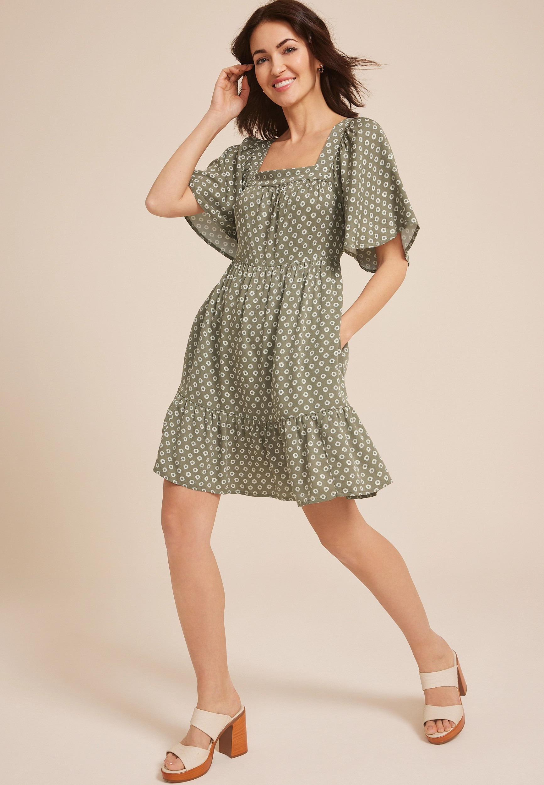 Maurices Women's Printed Flutter Sleeve Babydoll Dress Green Size Large