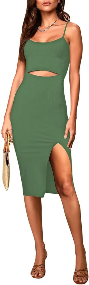 Pink Queen Women's Spaghetti Strap Cutout Side Slit Ribbed Knee Length Bodycon Midi Dress Club Pa...