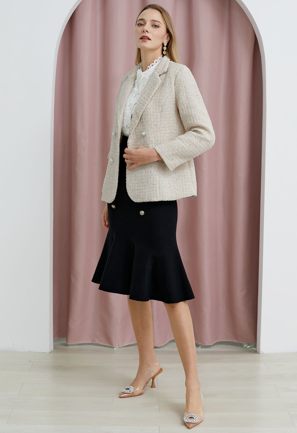 Metallic Tweed Double Breasted Blazer in Cream