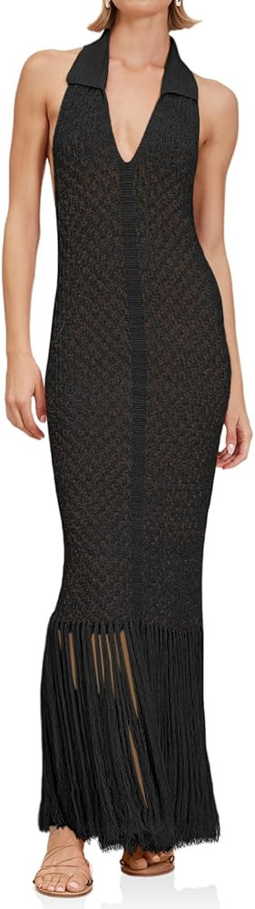 OYOANGLE Women's 2 Piece Outfits Graphic Print Knitted Crop Halter Top and Wide Leg Pants Set