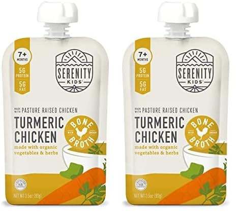 Serenity Kids Bone Broth Puree Made With Organic Veggies | Clean Label Project Purity Award Certified | 3.5 Ounce BPA-Free Pouch | Pasture Raised Turmeric Chicken | 1 Count (Pack of 2)