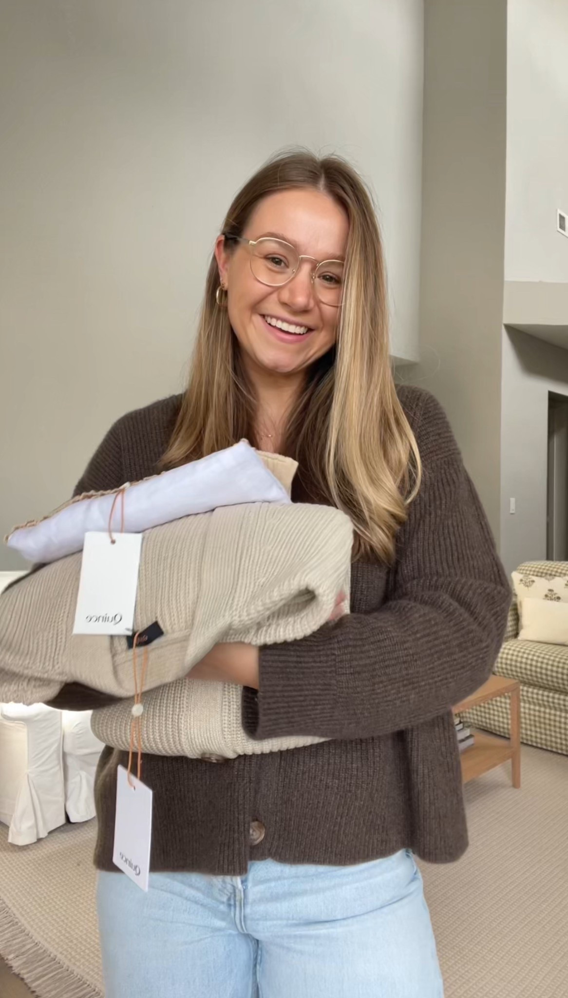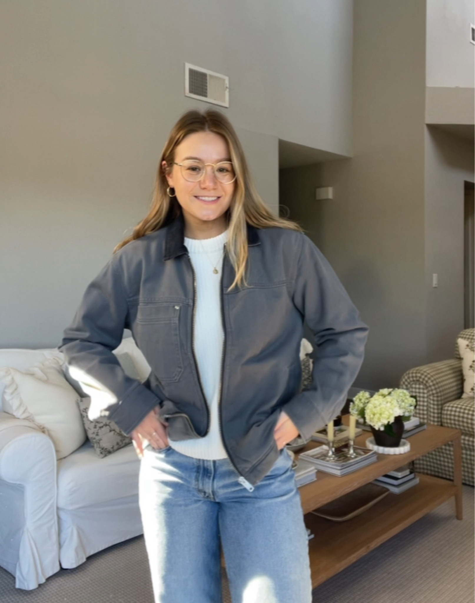 Cardigan is old sezane but linked similar, wearing medium. Jeans are Levi’s dad jeans wearing tts 27. Bag is cuyana. Shoes are Franco Sarto. Glasses are Eyebuydirect