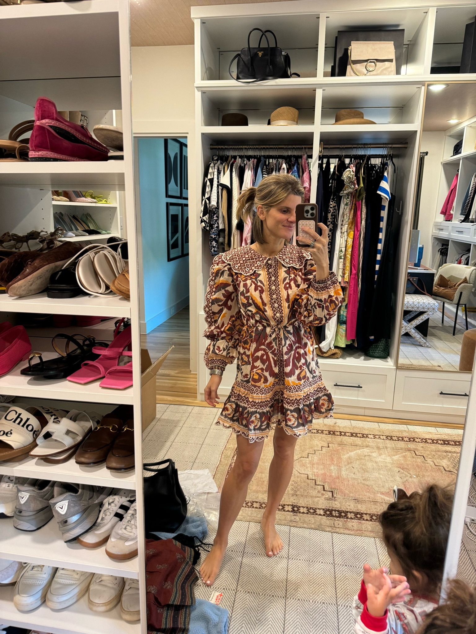 Line and dot brown dress (wearing XS). Under $200 FYI - dress has a little stretch but I’d say it runs pretty small. The fabric is high quality and super thick!