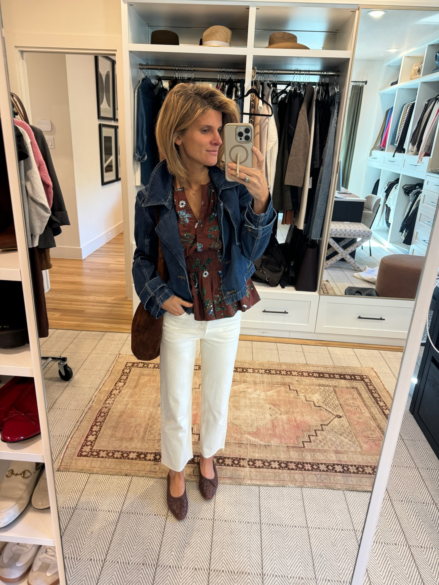 Jean on jean/denim on denim Agolde outfit w brown accessories.   Wearing TTS in jeans and XS in jacket.
