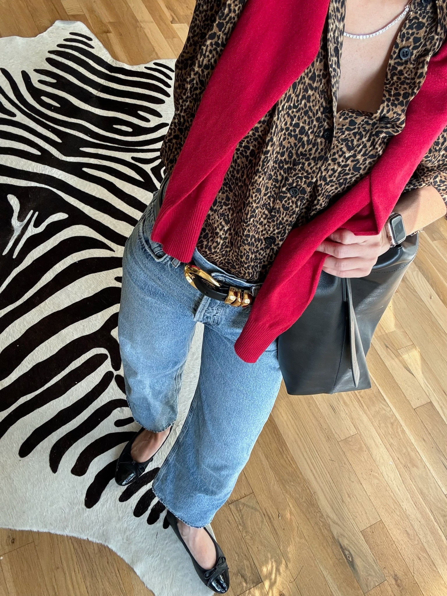 Ralph Lauren red cable cardigan and quince kick flare jeans