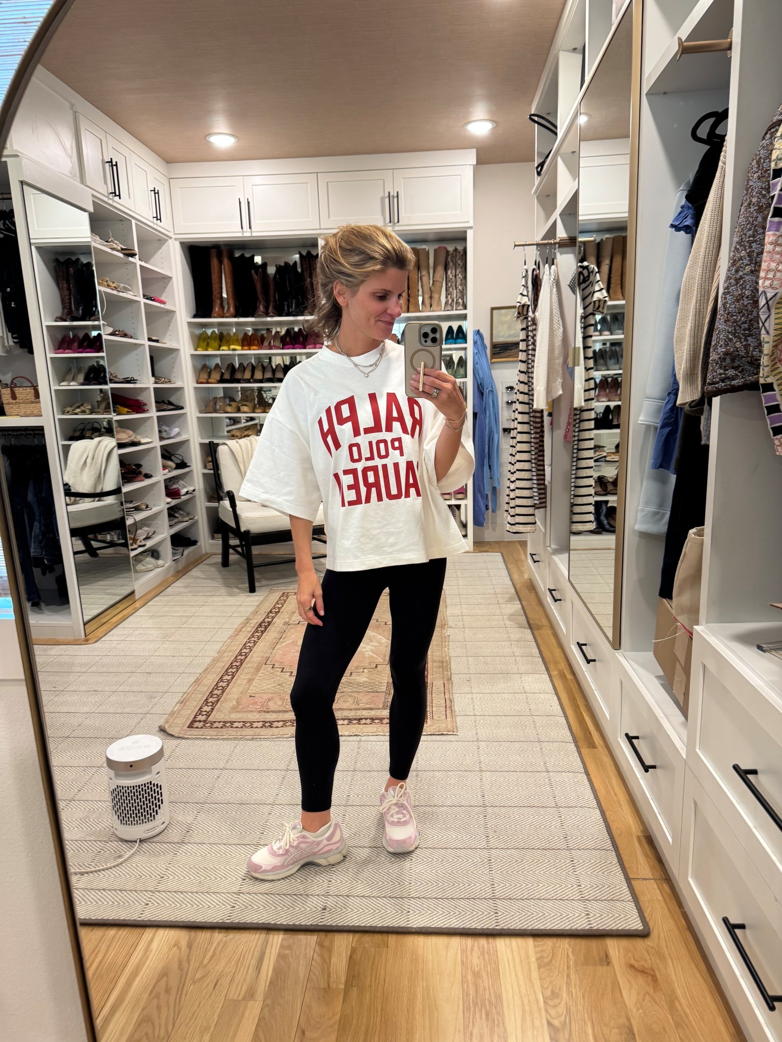 Leggings - SPLITS59 (XS). White Tee - Vuori (XS). Red Pullover - Spanx (XS).