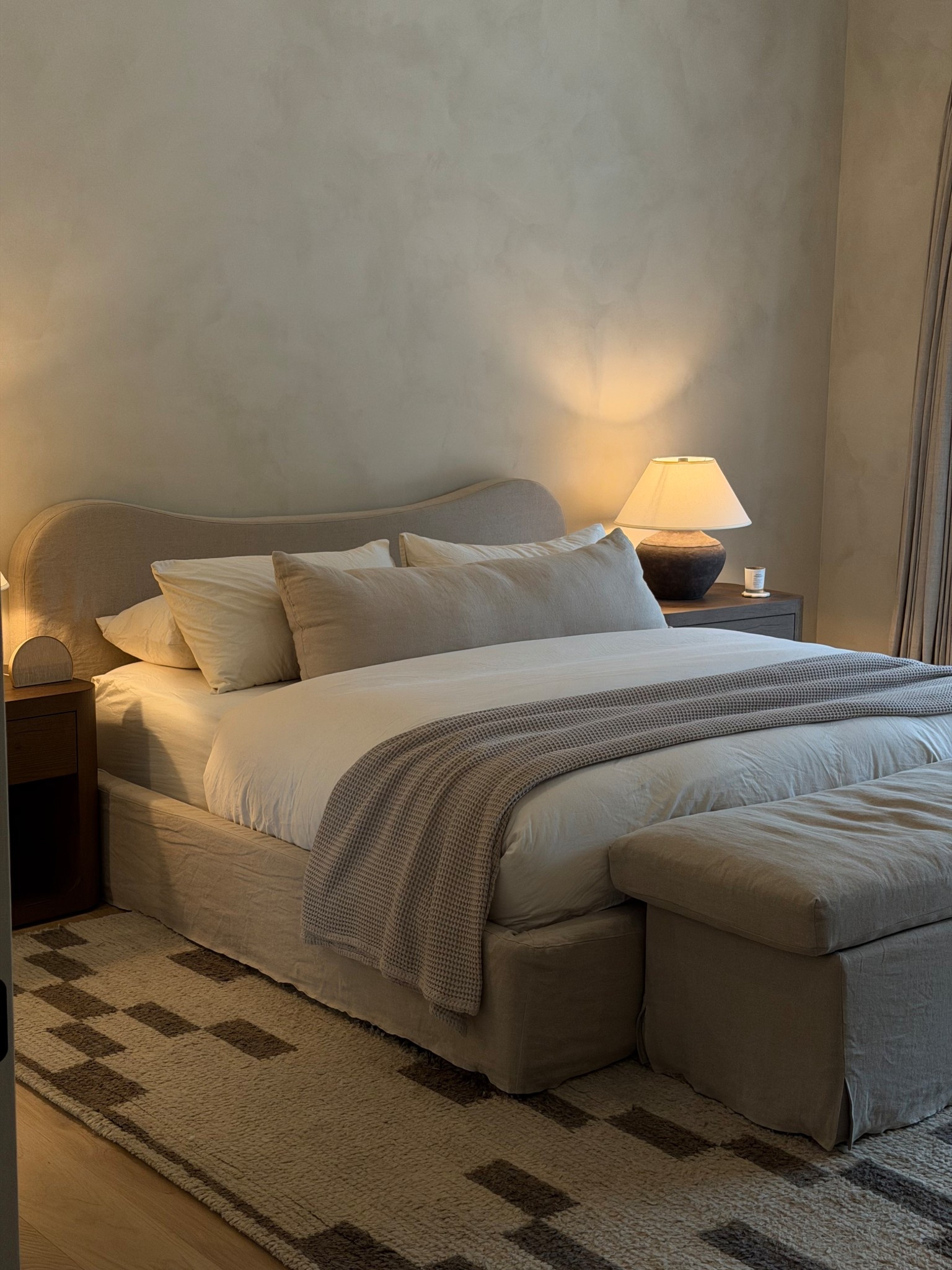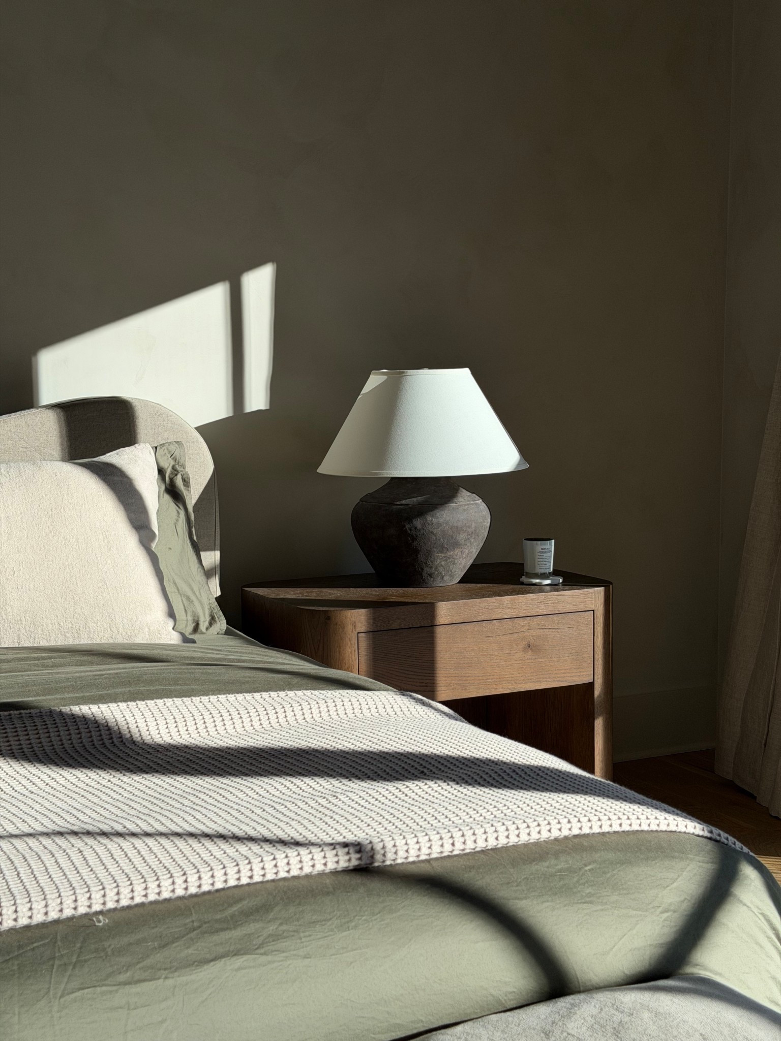 Brooklinen bedding in the color “oak”, Brooklinen throw blanket in the color “pebble”, and parachute lumbar pillow in the color “natural"