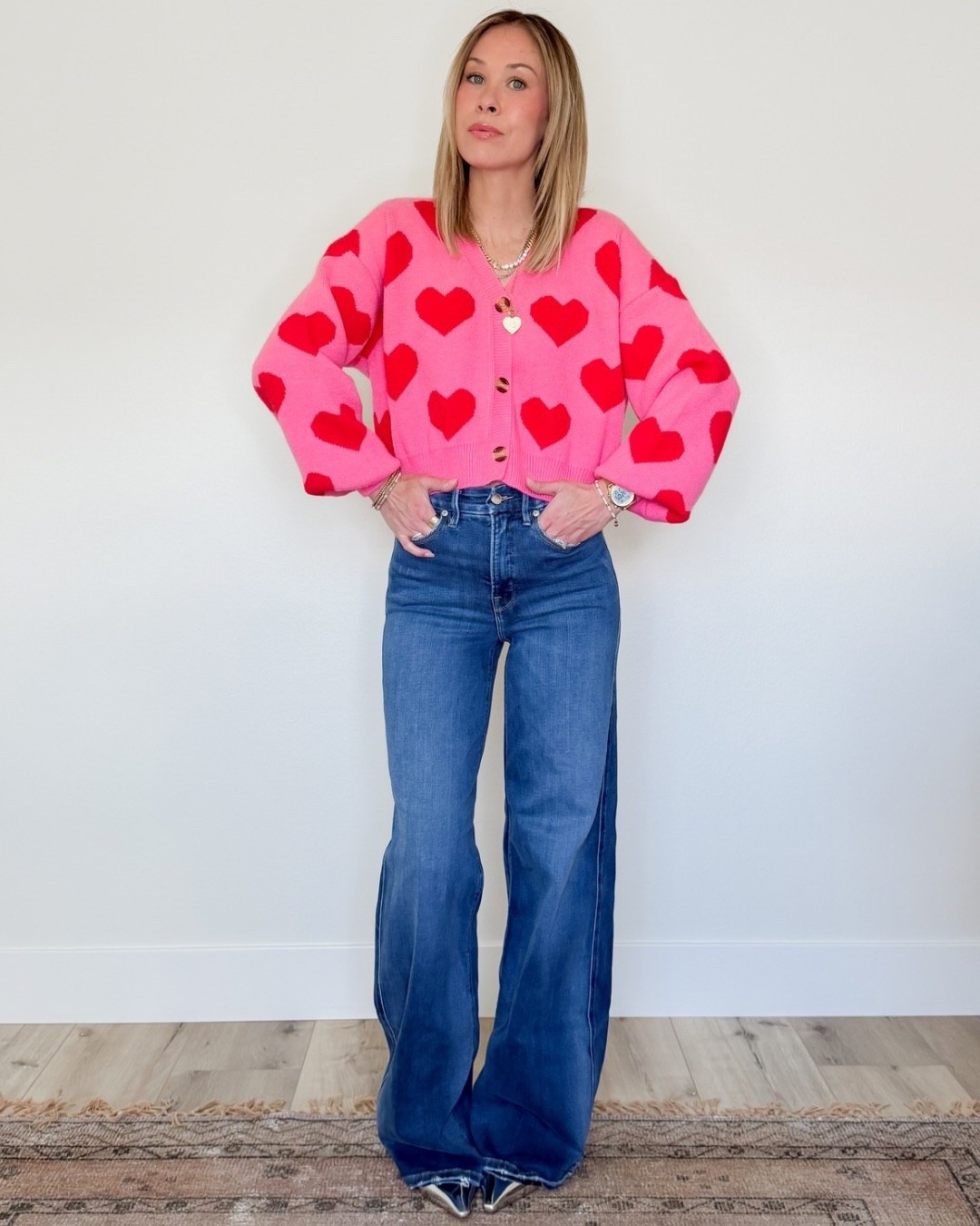 Wearing size M in the cardigan, 24 regular length in the jeans, and I’m 5’5” for reference
