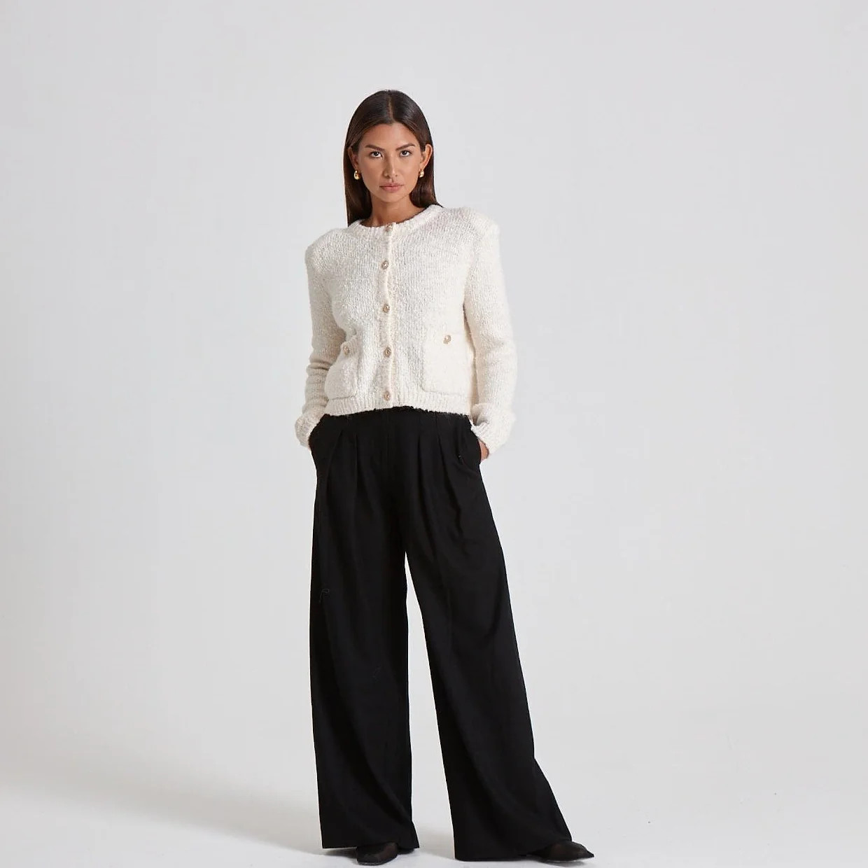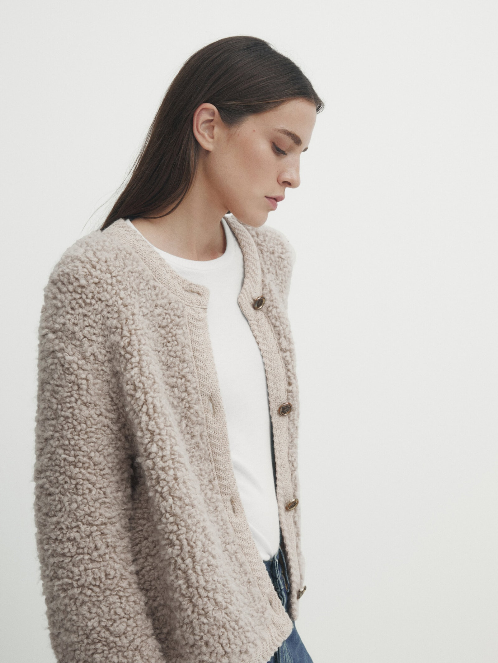 The perfect way to dress up jeans - a textured cardi with statement buttons is the new must have.