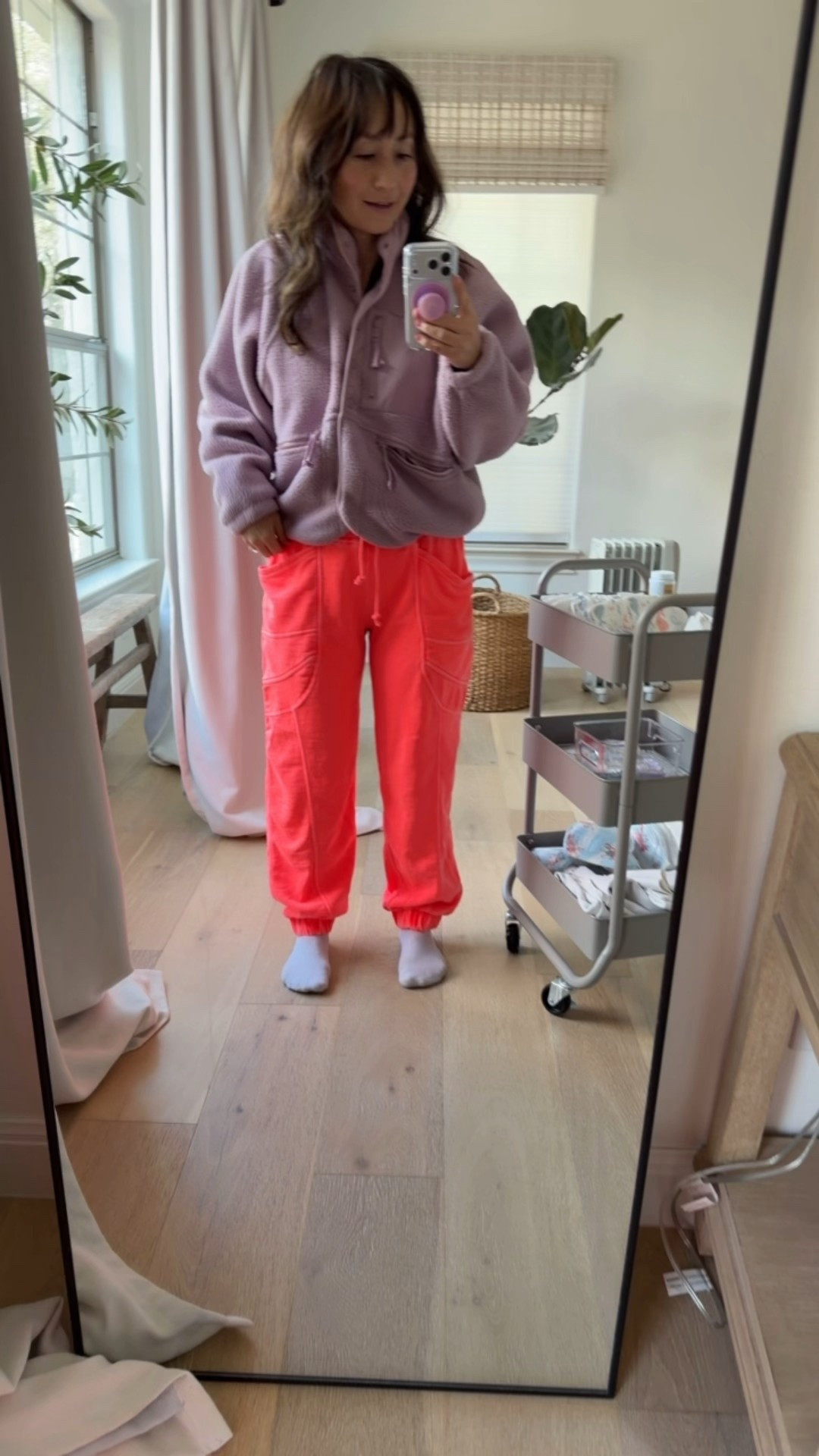 Wearing a small. I have this in another color from last season. These are super warm like you will get hot if you wear it in the house, but it’s perfect when it’s cool outside.