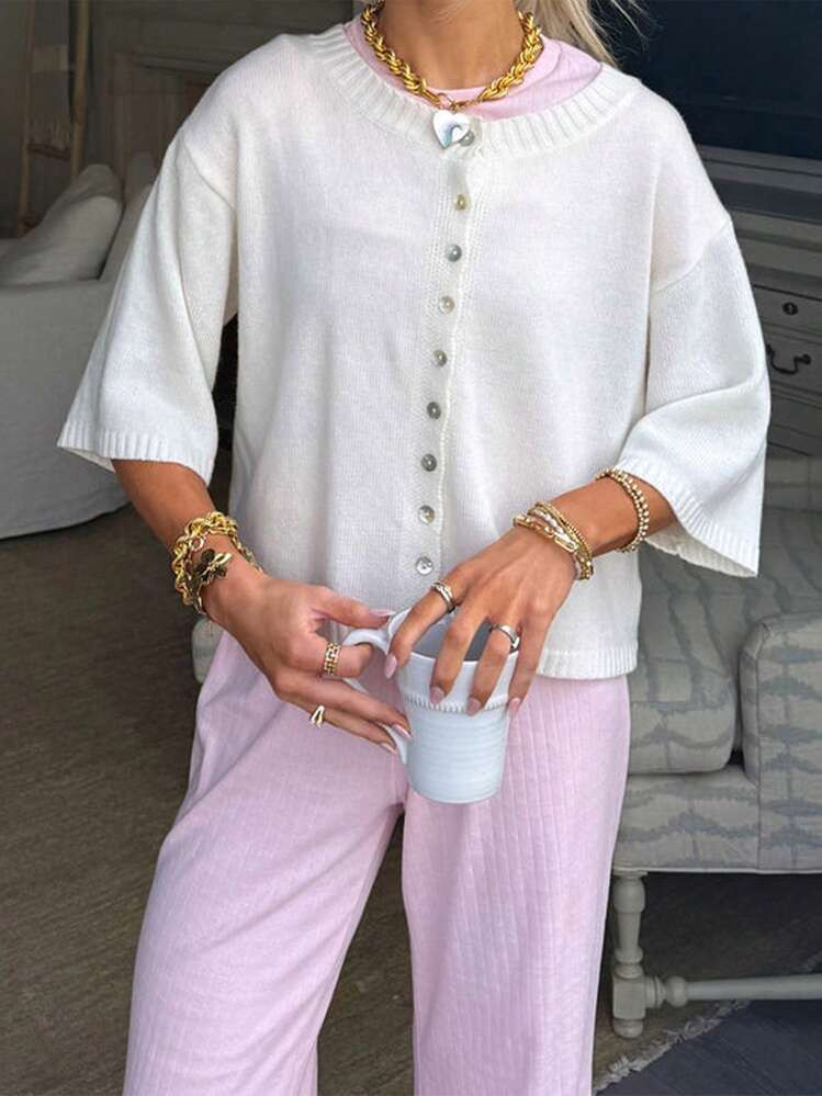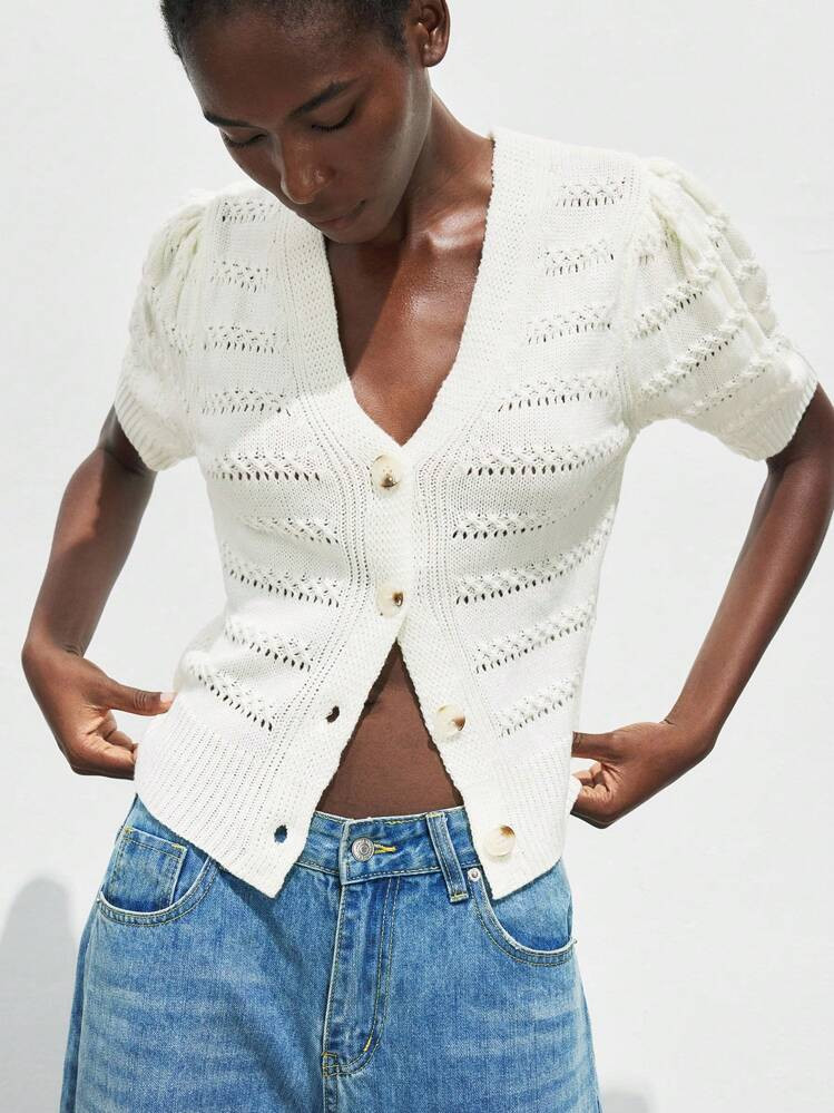 Maija Hollow V-Neck Single-Breasted Short Sleeve Knit Top,Business Casual Women's Wear, Office Wear, Low-Key Old Money Style, Effortless Temperament, High-End Urban Commuting, The Same Style As The Editor-In-Chief Of The Magazine, Urban Social Vacation Party Wear, Charming, Low-Key And Durable Basic Style, Versatile And Not Picky Clothing, Street Fashion Wear, Clothing, Coffee Shop, Relaxed Wear,Bohofeel Western Style Clothing, High-Grade Fabric, Comfortable And Breathable
